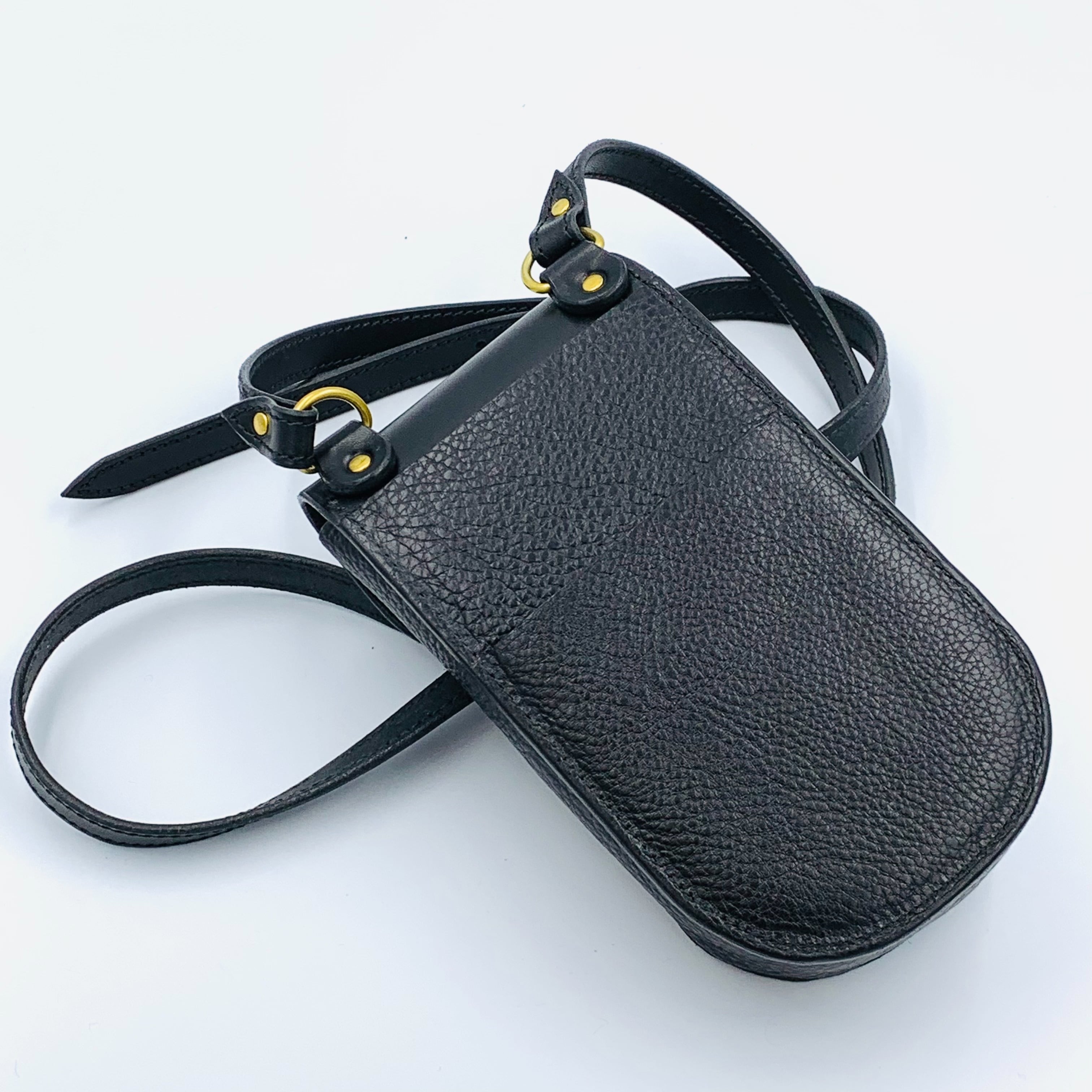 しなやかなレザーを、丈夫なフラップで支えるような造りのフォンショルダー